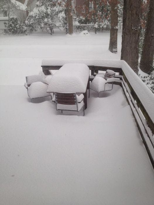 Reassuring friends watching from afar. We are inside and warm and hoping to stay that way. The appliances are now hooked up in the kitchen, so cooking is a bit more convenient. This was our deck at around 8 this morning, with the storm about half over.