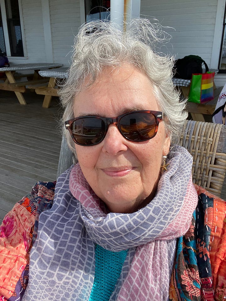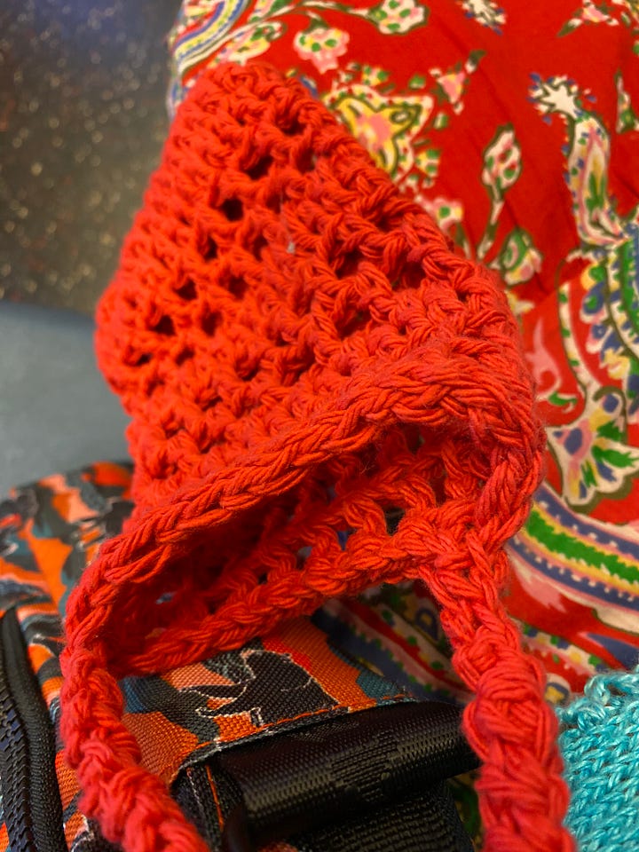 I am wearing all the clothes that wouldn’t fit in my backpack. A flowy paisley skirt. Pink, violet, green, and yellow swirls on a bright red background. A turquoise linen t-shirt I knitted several years ago and seldom wear. A huge voile scarf, pink and gray, very lightweight but just right for sleeping on the train. A cotton patchwork jacket covered with sashiko stitching in white and red. If all that weren’t enough, I am also carrying a cross-body bag with a vivid orange and black print, and a small orange phone pouch.