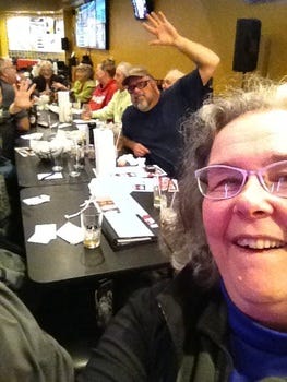 I hung out with the Stalwart Dems for the first three hours of election returns. That's Bob, the transplant from Brooklyn in the glasses and cap waving on the left. And on the right are my new friends Susan and Sean. The gloom descended on the room early on, and people started drifting off after ten. No one in the group expected Nebraska to turn blue, but they were hoping that a ballot measure to retain the ban on the death penalty would pass; it didn't. By close to eleven, I was starting to fade, and took my leave. Luckily, I was by myself when Florida was called. After that, I was caught between my need to know and my urge to curl up in an anxious ball. I slept maybe four hours in all.