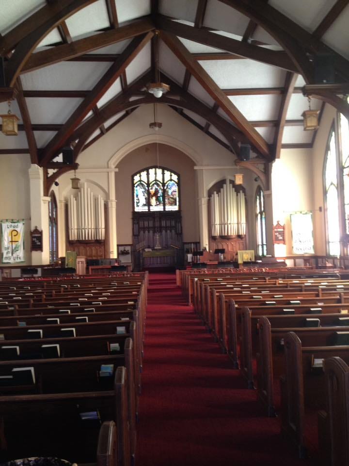 Turning west, I saw a familiar bell tower a few blocks away -- my old spiritual home, the 1st Evangelical Lutheran Church. In the building, I was struck with so many odd memories. The round posts in the parish hall were still there -- of course! They have to hold up the building; but they also were good for twirling around when covered dish suppers got too boring. I went upstairs to the sanctuary and it was all the same, except the carpet, which couldn't possibly be the original. How many Sundays did I sit looking at these very same stained glass windows?